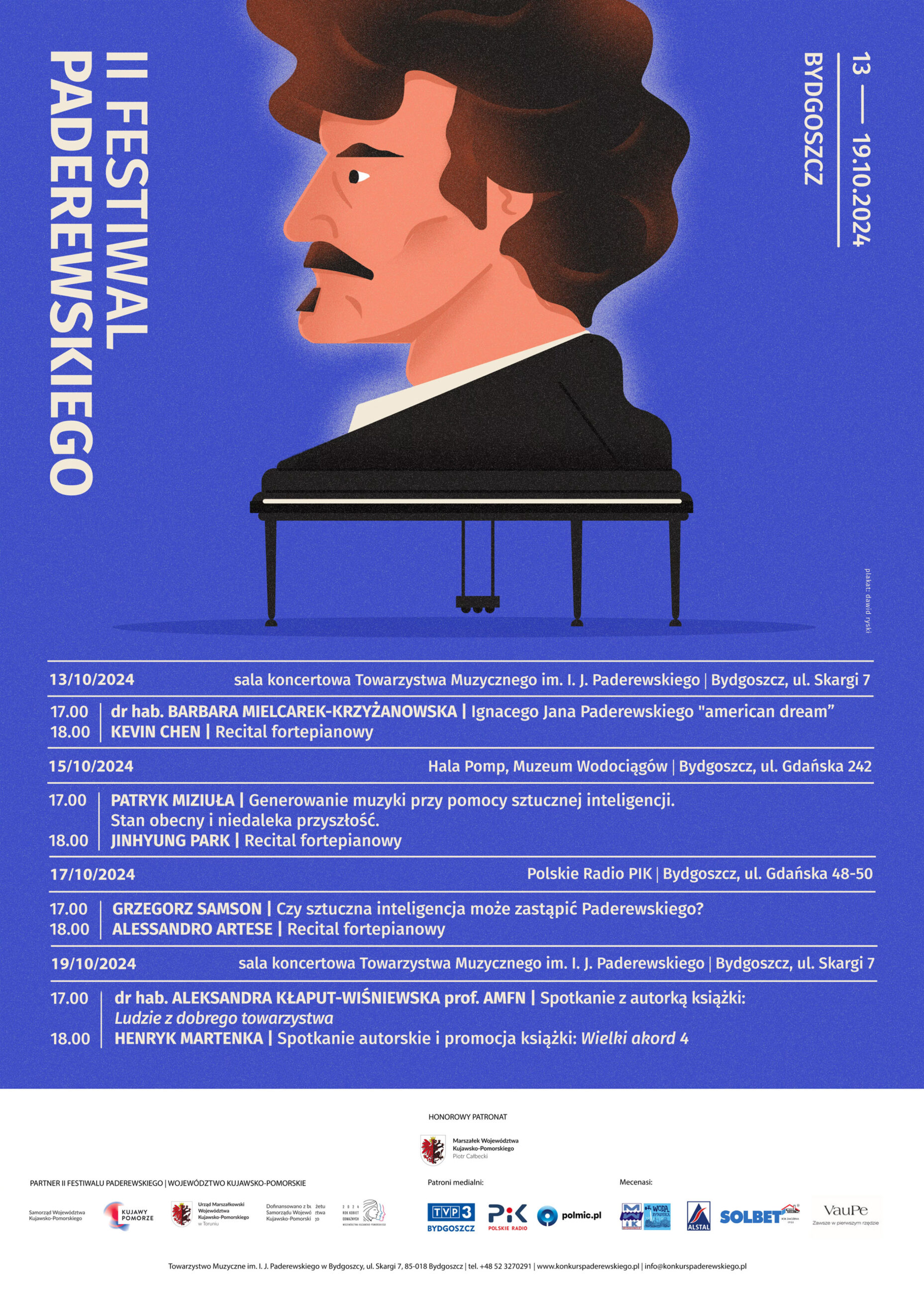 19 października 2024, powrócimy do siedziby Towarzystwa Muzycznego im. I. J. Paderewskiego na dwa spotkania autorskie. dr hab. Aleksandra Kłaput-Wiśniewska, profesor Akademii Muzycznej im. Feliksa Nowowiejskiego w Bydgoszczy, autorka książki Ludzie z dobrego towarzystwa, przedstawi historię Towarzystwa Muzycznego im. I. J. Paderewskiego w Bydgoszczy. Na zakończenie Festiwalu odbędzie się promocja czwartego tomu książki Wielki akord i spotkanie z Henrykiem Martenką, autorem cyklu o kulisach Międzynarodowych Konkursów Pianistycznych im. I. J. Paderewskiego.